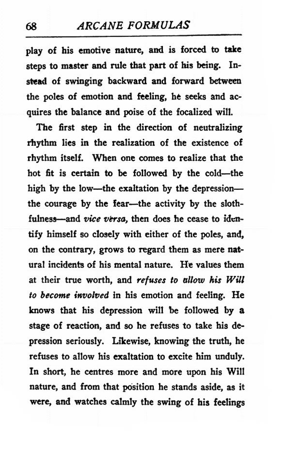 The first step in the direction of neutralizing rhythm lies in the realization of the existence of rhythm itself. When one comes to realize that the hot fit is certain to be followed by the cold --- the high by the low --- the exaltation by the depression --- the courage by the fear --- the activity by the slothfulness --- and vice versa, then does he cease to identify himself so closely with either of the poles, and, on the contrary, grows to regard them as mere natural incidents of his mental nature. He values them at their true worth, and refuses to allow his Will to become involved in his emotion and feeling. He knows that his depression will be followed by a stage of reaction, and so he refuses to take his depression seriously. Likewise, knowing the truth, he refuses to allow his exaltation to excite him unduly. In short, he centres more and more upon his Will nature, and from that position he stands aside, as it were, and watches calmly the swing of his feelings