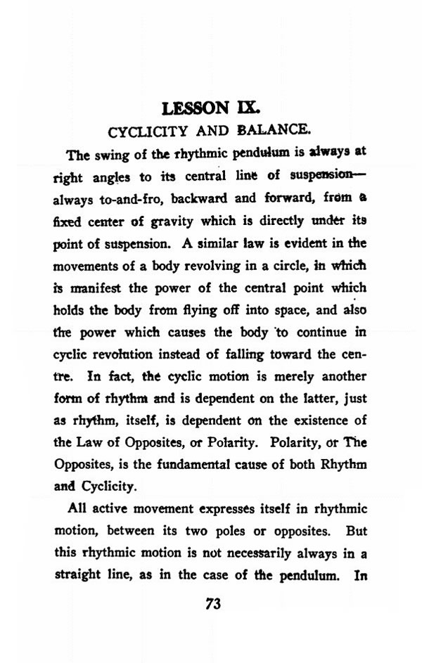 The swing of the rhythmic pendulum M always at right angles to its central line of suspension --- always to-and-fro, backward and forward, from a fixed center of gravity which is directly under its point of suspension. A similar law is evident in the movements of a body revolving in a circle, in which is manifest the power of the central point which holds the body from flying off into space, and also the power which causes the body to continue in cyclic revolution instead of falling toward the centre. In fact, the cyclic motion is merely another form of rhythm and is dependent on the latter, just as rhythm, itself, is dependent on the existence of the Law of Opposites, or Polarity. Polarity, or The Opposites, is the fundamental cause of both Rhythm and Cyclicity.