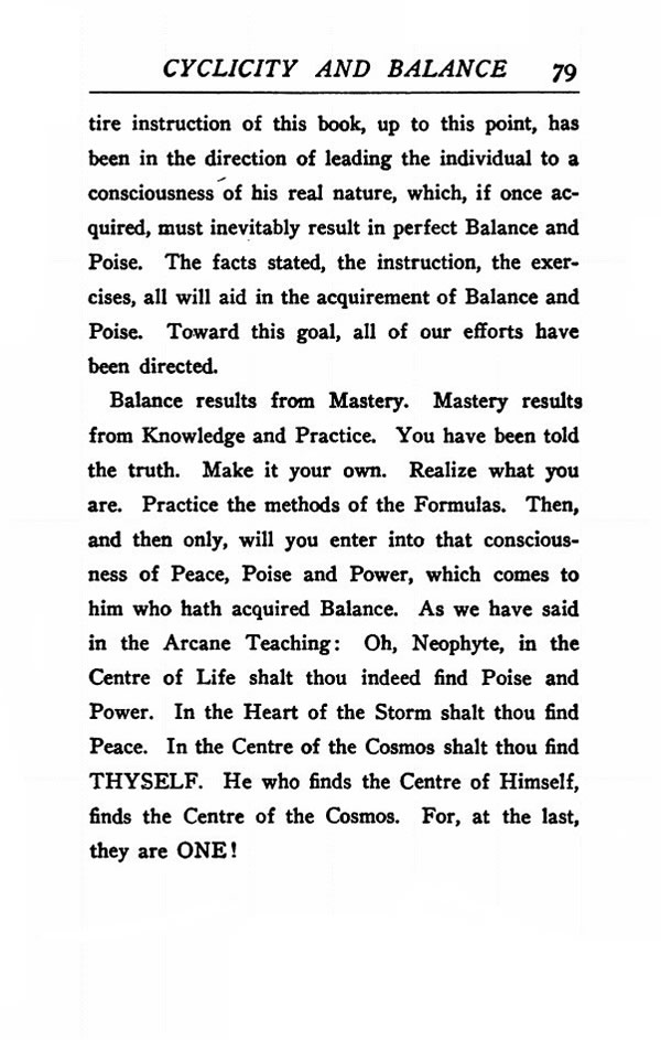 Balance results from Mastery. Mastery results from Knowledge and Practice. You have been told the truth. Make it your own. Realize what you are. Practice the methods of the Formulas. Then, and then only, will you enter into that consciousness of Peace. Poise and Power, which comes to him who hath acquired Balance. As we have said in the Arcane Teaching: Oh, Neophyte, in the Centre of Life shalt thou indeed find Poise and Power. In the Heart of the Storm shalt thou find Peace. In the Centre of the Cosmos shalt thou find THYSELF. He who finds the Centre of Himself, finds the Centre of the Cosmos. For, at the last, they are ONE!