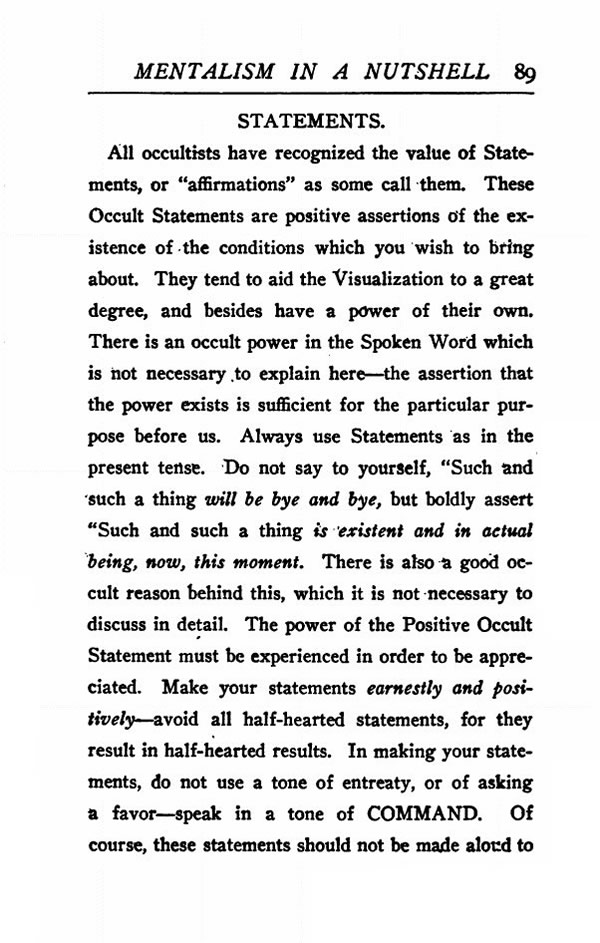 All occultists have recognized the value of Statement; or "affirmations" as some call them. These Occult Statements are positive assertions of the existence of the conditions which you wish to bring about. They tend to aid the Visualization to a great degree, and besides have a tower of their own. There is an occult power in the Spoken Word which is not necessary to explain here --- the assertion that the power exists is sufficient for the particular purpose before us. Always use Statements as in the present tense. Do not say to yourself, "Such and such a thing will be bye and bye, but boldly assert "Such and such a thing is existent and in actual being, now, this moment. There is also a good occult reason behind this, which it is not necessary to discuss in detail. The power of the Positive Occult Statement must be experienced in order to be appreciated. Make your statements earnestly and positively --- avoid all half-hearted statements, far they result in half-hearted results. In making your statements, do not use a tone of entreaty, or of asking a favor --- speak in a tone of COMMAND. Of course, these statements should not be made aloud to