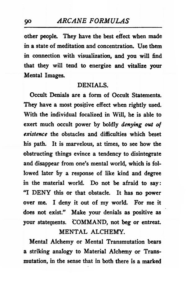 Occult Denials are a form of Occult Statements. They have a most positive effect when rightly used. With the individual focalized in Will he is able to exert much occult power by boldly denying out of existence the obstacles and difficulties which beset his path. It is marvelous, at times, to see how the obstructing things evince a tendency to disintegrate and disappear from one's mental world, which is followed later by a response of like kind and degree in the material world. Do not he afraid to say: "I DENY this or that obstacle. It has no power over me. I deny it out of my world. For me it does not exist." Make your denials as positive as your statements. COMMAND, not beg or entreat.