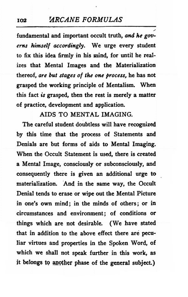 The careful student doubtless will have recognized by this time that the process of Statements and Denials are but forms of aids to Mental Imaging. When the Occult Statement is used, there is created a Mental Image, consciously or subconsciously, and consequently there is given an additional urge to materialization. And in the same way, the Occult Denial tends to erase or wipe out the Mental Picture in one's own mind; in the minds of others; or in circumstances and environment; of conditions or things which are not desirable. (We have stated that in addition to the above effect there are peculiar virtues and properties in the Spoken Word, of which we shall not speak further in this work, as it belongs to another phase of the general subject)