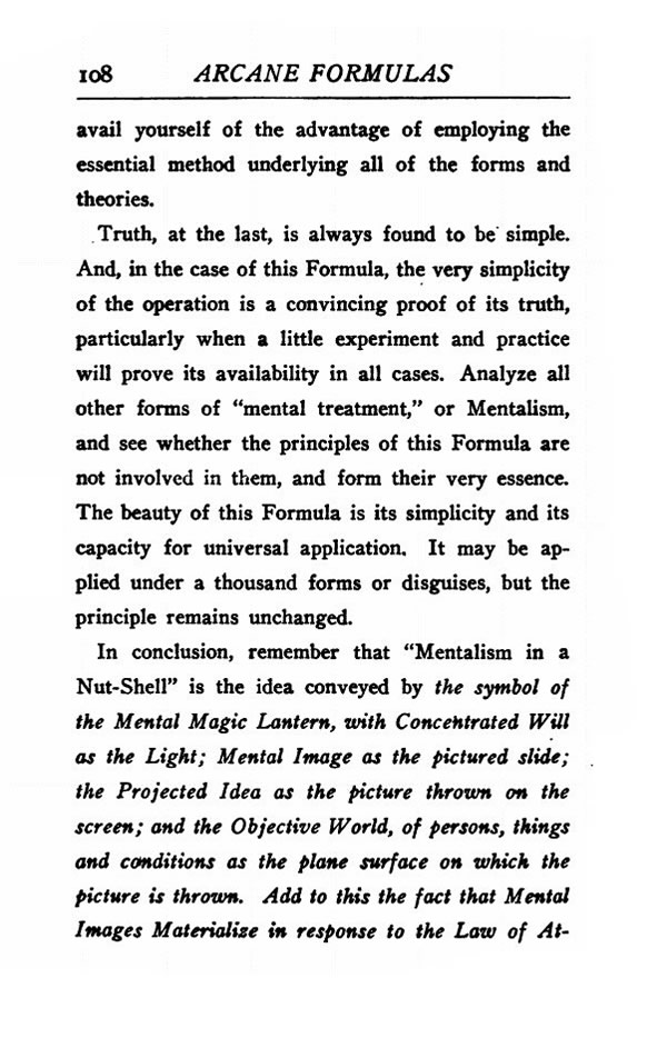 Truth, at the last, is always found to be simple. And, in the case of this Formula, the very simplicity of the operation is a convincing proof of its truth, particularly when a little experiment and practice will prove its availability in all cases. Analyze all other forms of "mental treatment," or Mentalism, and see whether the principles of this Formula are not involved in them, and form their very essence. The beauty of this Formula is its simplicity and its capacity for universal application. It may be applied under a thousand forms or disguises, but the principle remains unchanged.