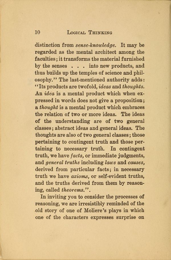 1 - Reasoning - 2 - Process of Reasoning - 3 - The Concept - 4 - The Use of Concepts - 5 - Concepts and Images - 6 - Terms - 7 - Meaning of Terms - 8 - Judgments - 9 - Propositions - 10 - Immediate Reasoning - 11 - Inductive Reasoning - 12 - Reasoning by Induction - 13 - Theory and Hypotheses - 14 - Making and Testing Hypotheses - 15 - Deductive Reasoning - 16 - The Syllogism - 17 - Varieties of Syllogisms - 18 - Reasoning by Analogy - 19 - Fallacies -