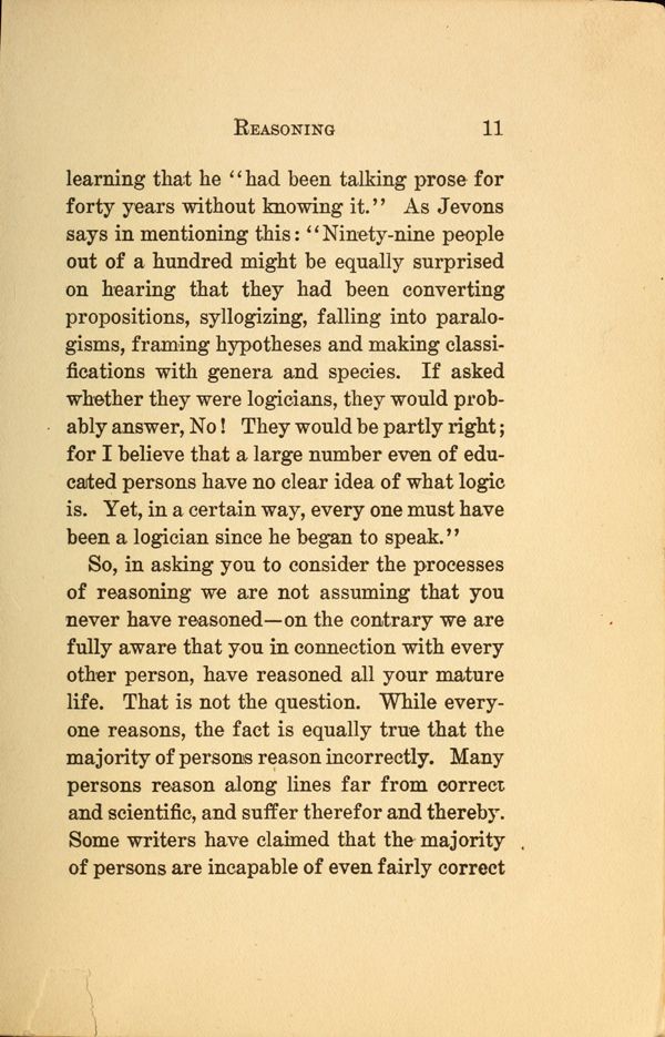 learning that he "had been talking prose for forty years without knowing it." As Jevons says in mentioning this: "Ninety-nine people out of a hundred might be equally surprised on hearing that they had been converting propositions, syllogizing, falling into paralogisms, framing hypotheses and making classifications with genera and species. If asked whether they were logicians, they would probably answer, No! They would be partly right for I believe that a large number even of educated persons have no clear idea of what logic is. Yet, in a. certain way, every one must have been a logician since he began to speak."