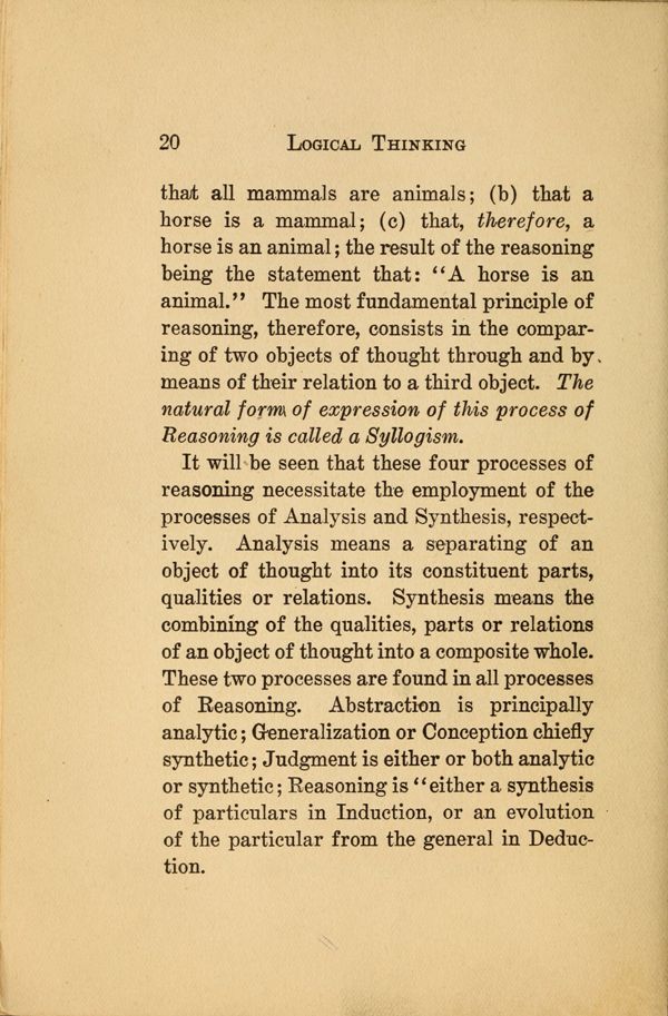 It will be seen that these four processes of reasoning necessitate the employment of the processes of Analysis and Synthesis, respectively. Analysis means a separating of an object of thought into its constituent parts, qualities or relations. Synthesis means the combining of the qualities, parts or relations of an object of thought into a composite whole. These two processes are found in all processes of Reasoning. Abstraction is principally analytic; Generalization or Conception chiefly synthetic; Judgment is either or both analytic or synthetic; Reasoning is "either a synthesis of particulars in Induction, or an evolution of the particular from the general in Deduction.