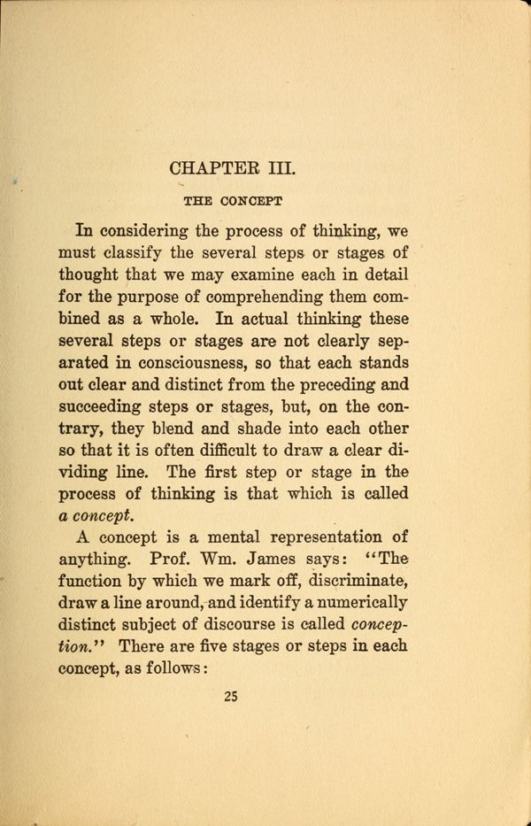 In considering the process of thinking, we must classify the several steps, or stages, of thought that we may examine each in detail for the purpose of comprehending them combined as a whole. In actual thinking these several steps or stages are not clearly separated in consciousness, so that each stands out clear and distinct from the preceding and succeeding steps or stages, but, on the contrary, they blend and shade into each other so that it is often difficult to draw a clear dividing line. The first step or stage in the process of thinking is that which is called a concept.