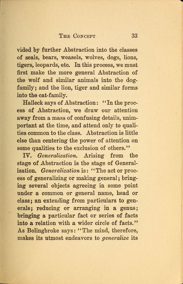 by further Abstraction into the classes of seals, bears, weasels, wolves, dogs, lions, tigers, leopards, etc. In this process, we must first make the more general Abstraction of the wolf and similar animals into the dog family and the lion, tiger and similar forms into the cat-family.