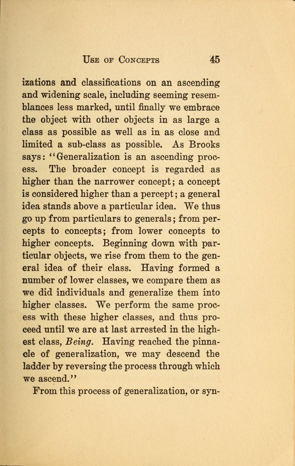 and classifications on an ascending and widening scale, including seeming resemblances less marked, until finally we embrace the object with other objects in as large a class as possible as well as in as close and limited a sub-class as possible. As Brooks says: " Generalization is an ascending process. The broader concept is regarded as higher than the narrower concept a concept is considered higher than a percept a general idea stands above a particular idea. We thus go up from particulars to generals from percepts to concepts; from lower concepts to higher concepts. Beginning down with particular objects, we rise from them to the general idea of their class. Having formed a number of lower classes, we compare them as we did individuals and generalize them into higher classes. We perform the same process with these higher classes, and thus proceed until we are at last arrested in the highest class, Being. Having reached the pinnacle of generalization, we may descend the ladder by reversing the process through which we ascend."