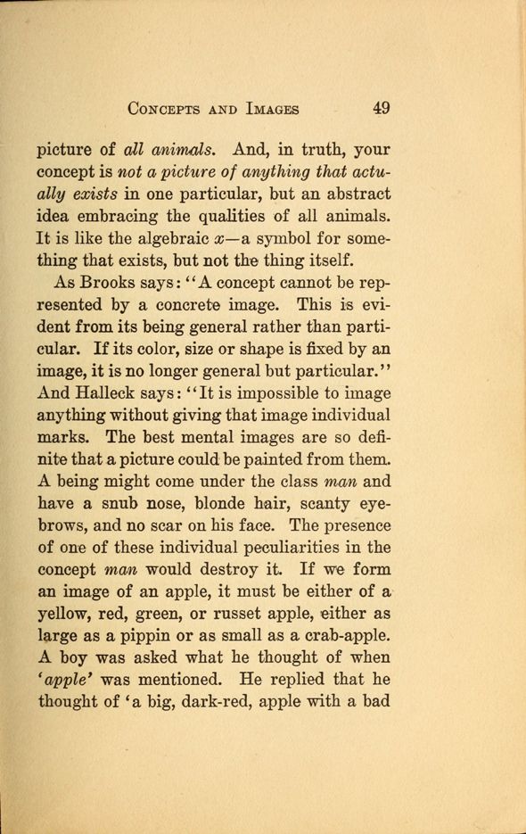 As Brooks says,: "A concept cannot be represented by a concrete image. This is evident from its being general rather than particular. If its color, size or shape is fixed by an image, it is no longer general but particular." And Halleck says: "It is impossible to image anything without giving that image individual marks. The best mental images are so definite that a picture could be painted from them. A being might come under the class man and have a snub nose, blonde hair, scanty eyebrows, and no scar on his face. The presence of one of these individual peculiarities in the concept man would destroy it. If we form an image of an apple, it must be either of a yellow, red, green, or russet apple, either as large as a pippin or as, small as a crab-apple. A boy was asked what he thought of when `apple' was mentioned. He replied that he thought of ' a big, dark-red, apple with a bad