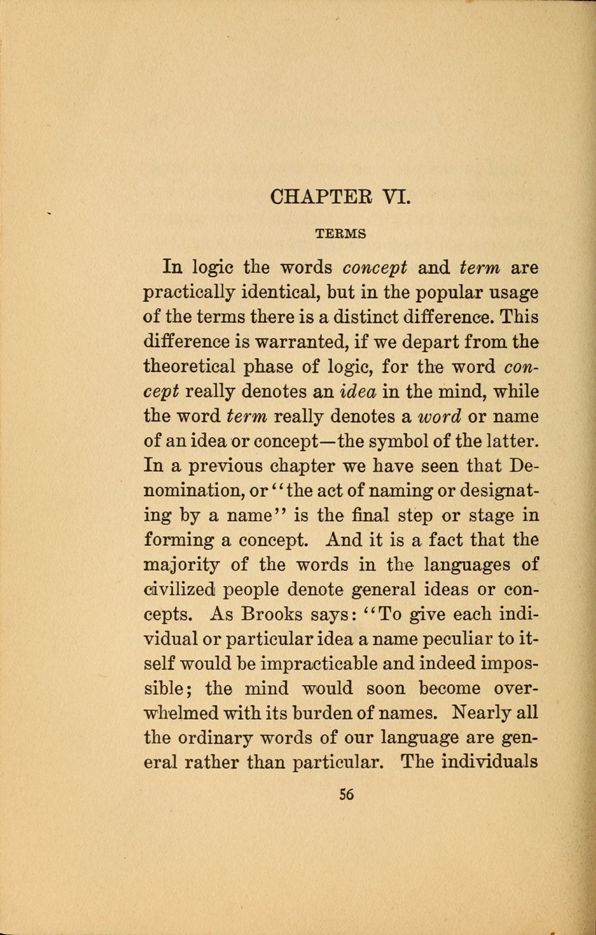 In logic the words concept and term are practically identical, but in the popular usage of the terms there is a distinct, difference. This difference is warranted, if we depart from the theoretical phase of logic, for the word concept really denotes an idea in the mind, while the word term really denotes a word or name of an idea or concept the symbol of the latter. In a previous chapter we have seen that Denomination, or "the act of naming or designating by a name" is the final step or stage in forming a. concept. And it is a fact that the majority of the words in the languages of civilized people denote general ideas or concepts. As Brooks says: "To give each individual or particular idea a. name peculiar to itself would be impracticable and indeed impossible; the mind would soon become overwhelmed with its burden of names. Nearly all the ordinary words of our language are general rather than particular. The individuals