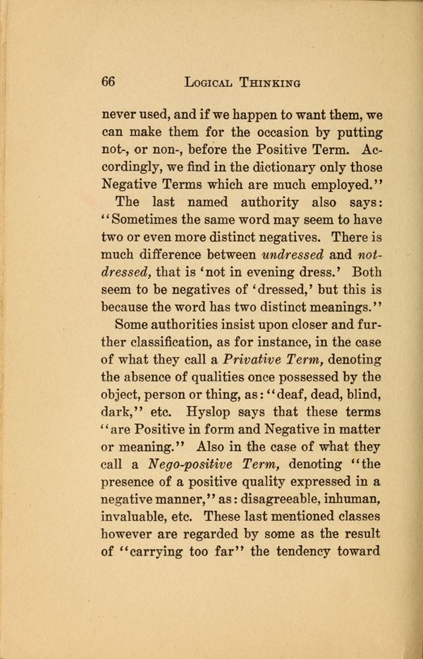Some authorities insist upon closer and further classification, as for instance, in the case of what they call a Privative Term, denoting the absence of qualities once possessed by the object, person or thing, as: " deaf, dead, blind, dark," etc. Hyslop says that these terms "are Positive in form and Negative in matter or meaning." Also in the case of what they call a Nego-positive Term, denoting " the presence of a positive quality expressed in a negative manner," as: disagreeable, inhuman, invaluable, etc. These last mentioned classes however are regarded by some as the result of "carrying too far" the tendency toward