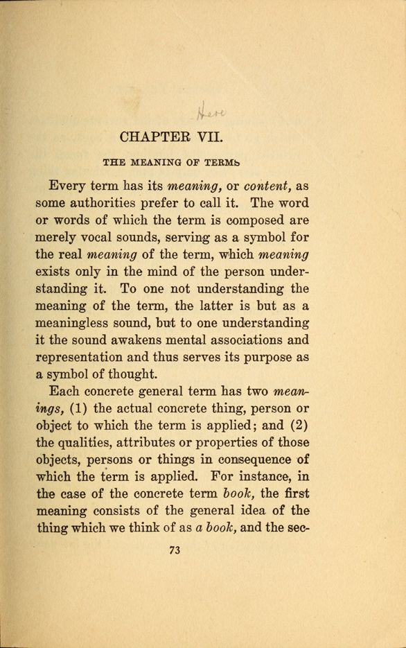 Every term has its meaning, or content, as some authorities prefer to call it. The word or words of which the term is composed are merely vocal sounds, serving as a. symbol for the real meaning of the term, which meaning exists only in the mind of the person understanding it. To one not understanding the meaning of the term, the latter is but as a meaningless sound, but to one understanding it the sound awakens mental associations and representation and thus serves its purpose as a symbol of thought.