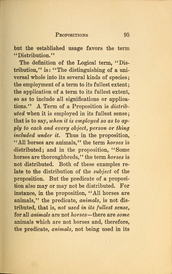 The definition of the Logical term, "Distribution," is: " The distinguishing of a universal whole into its several kinds of species the employment of a term to its fullest extent the application of a term to its fullest extent, so as to include all significations or applications." A Term of a. Proposition is distributed when it is employed in its fullest sense that is to say, when it is employed so as to apply to each and every object, person or thing included under it. Thus in the proposition, "All horses are animals," the term horses is distributed; and in the proposition, "Some horses are thoroughbreds," the term horses is not distributed. Both of these examples relate to the distribution of the subject of the proposition. But the predicate of a. proposition also may or may not be distributed. For instance, in the proposition, "All horses are animals," the predicate, animals, is not distributed, that is, not used in its fullest sense, for all animals are not horses there are some animals which are not horses and, therefore, the predicate, animals, not being used in its
