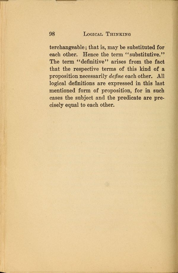1 - Reasoning - 2 - Process of Reasoning - 3 - The Concept - 4 - The Use of Concepts - 5 - Concepts and Images - 6 - Terms - 7 - Meaning of Terms - 8 - Judgments - 9 - Propositions - 10 - Immediate Reasoning - 11 - Inductive Reasoning - 12 - Reasoning by Induction - 13 - Theory and Hypotheses - 14 - Making and Testing Hypotheses - 15 - Deductive Reasoning - 16 - The Syllogism - 17 - Varieties of Syllogisms - 18 - Reasoning by Analogy - 19 - Fallacies -