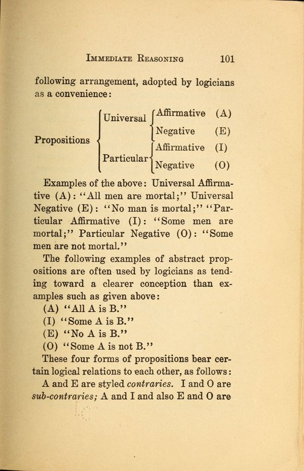 These four forms of propositions bear certain logical relations to each other, as follows: A and E are styled contraries. I and 0 are sub-contraries; A and I and also E and 0 are