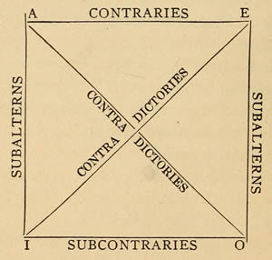 A close study of these relations, and the symbols expressing them, is necessary for a clear comprehension 'of the Laws of Opposition stated a little further back, as well as the principleis of Conversion which we shall mention a little further on. The following chart, called the Square of Opposition, is also employed by logicians to illustrate the relations between the four classes of propositions: