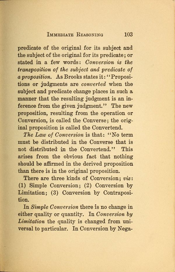 predicate of the original for its subject and the subject of the original for its predicate; or stated in a few words: Conversion is the transposition of the subject and predicate of a proposition. As Brooks states it: "Propositions or judgments are converted when the subject and predicate change places in such a manner that the resulting judgment is an inference from the given judgment." The new proposition, resulting from the operation or Conversion, is called the Converse; the original proposition is called the Convertend.
