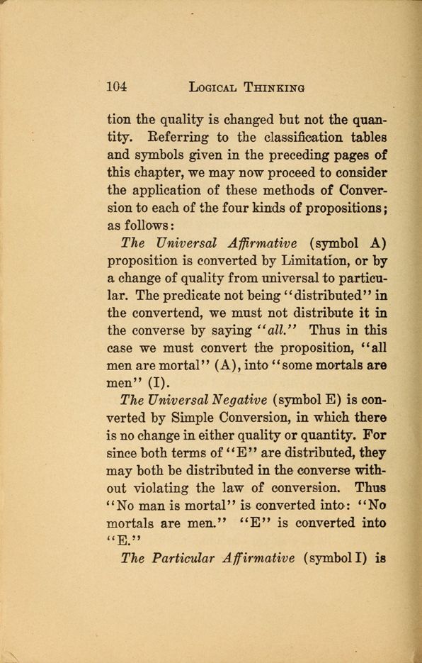 The Universal Negative (symbol E) is converted by Simple Conversion, in which there is no change in either quality or quantity. For since both terms of "E" are distributed, they may both be distributed in the converse without violating the law of conversion. Thus No man is mortal" is converted into "No mortals are men." "E" is converted into "E.", The Particular Affirmative (symbol I) is