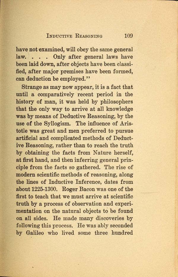 Strange as may now appear, it is a. fact that until a comparatively recent period in the history of man, it was held by philosophers that the only way to arrive at all knowledge was by means of Deductive Reasoning, by the use of the Syllogism. The influence of Aristotle was great and men preferred to pursue artificial and complicated methods of Deductive Reasoning, rather than to reach the truth by obtaining the facts from Nature herself, at first hand, and then inferring general principle from the facts so gathered. The rise of modern scientific methods of reasoning, along the lines of Inductive Inference, dates from about 1225-1300. Roger Bacon was one of the first to teach that, we must arrive at scientific truth by a process of observation and experimentation on the natural objects to be found on all sides. He made many discoveries by following this process. He was ably seconded by Galileo who lived some three hundred