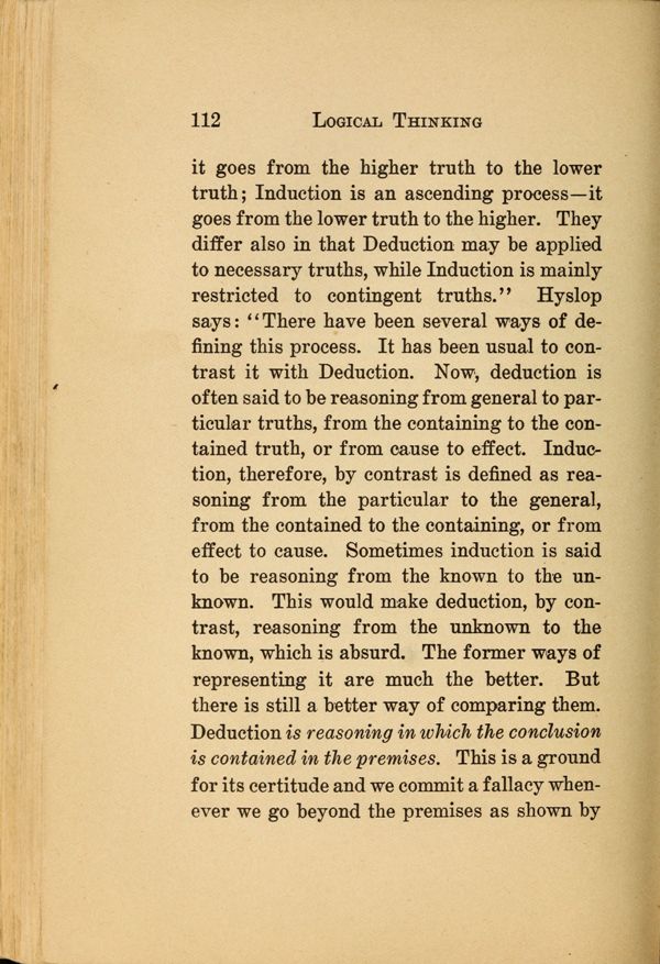 1 - Reasoning - 2 - Process of Reasoning - 3 - The Concept - 4 - The Use of Concepts - 5 - Concepts and Images - 6 - Terms - 7 - Meaning of Terms - 8 - Judgments - 9 - Propositions - 10 - Immediate Reasoning - 11 - Inductive Reasoning - 12 - Reasoning by Induction - 13 - Theory and Hypotheses - 14 - Making and Testing Hypotheses - 15 - Deductive Reasoning - 16 - The Syllogism - 17 - Varieties of Syllogisms - 18 - Reasoning by Analogy - 19 - Fallacies -