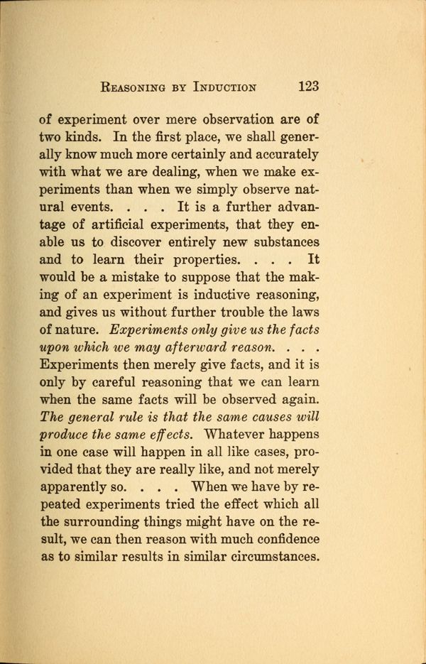 1 - Reasoning - 2 - Process of Reasoning - 3 - The Concept - 4 - The Use of Concepts - 5 - Concepts and Images - 6 - Terms - 7 - Meaning of Terms - 8 - Judgments - 9 - Propositions - 10 - Immediate Reasoning - 11 - Inductive Reasoning - 12 - Reasoning by Induction - 13 - Theory and Hypotheses - 14 - Making and Testing Hypotheses - 15 - Deductive Reasoning - 16 - The Syllogism - 17 - Varieties of Syllogisms - 18 - Reasoning by Analogy - 19 - Fallacies -