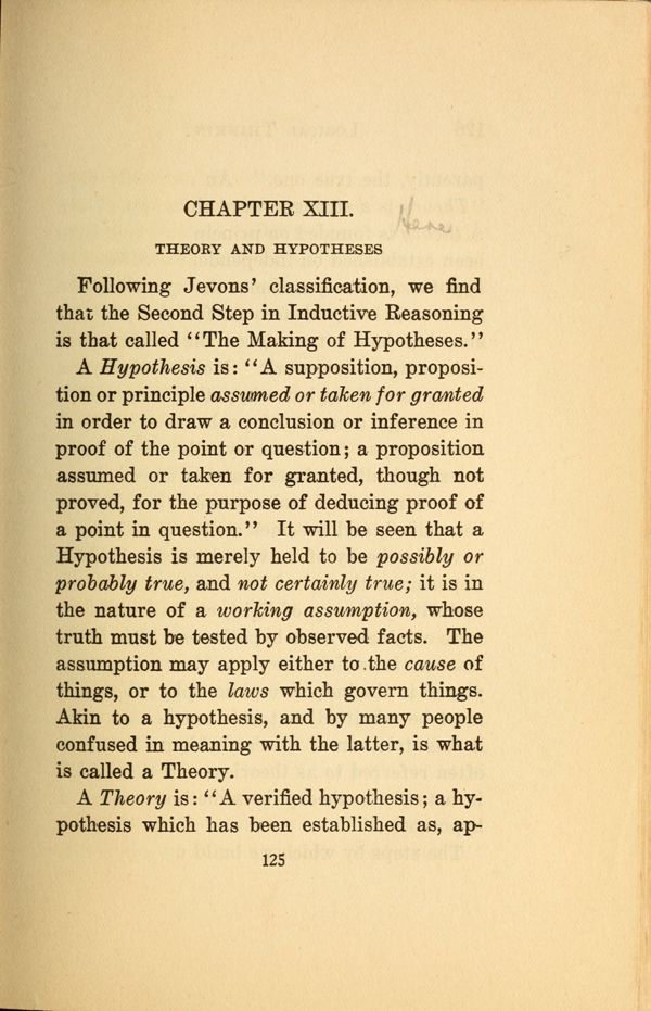 A Hypothesis is: "A supposition, proposition or principle assumed or taken for grated in order to draw a conclusion or inference in proof of the point or question; a proposition assumed or taken for granted, though not proved, for the purpose of deducing proof of a point in question." It will be seen that a Hypothesis is merely held to be possibly or probably true, and not certainly true; it is in the nature of a. working assumption, whose truth must be tested by observed facts. The assumption may apply either to the cause of things, or to the laws which govern things. Akin to a hypothesis, and by many people confused in meaning with the latter, is what is called a Theory.