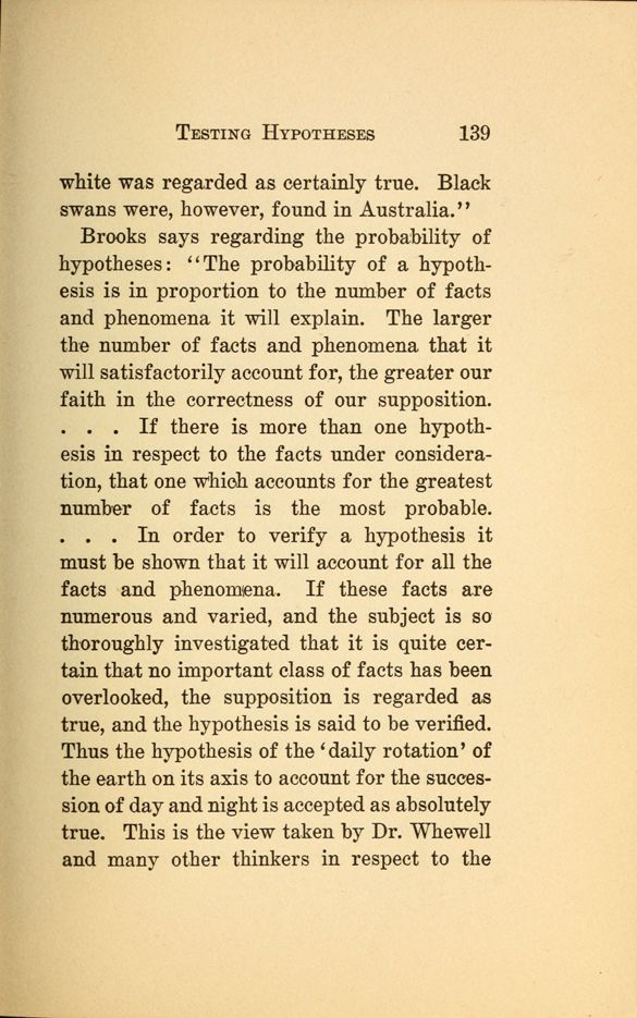 . . In order to verify a hypothesis it must be shown that it will account for all the facts and phenomena. If these facts are numerous and varied, and the subject is so thoroughly investigated that it is quite certain that no important class of facts has been overlooked, the supposition is regarded as true, and the hypothesis is said to be verified. Thus the hypothesis of the 'daily rotation' of the earth on its axis to account for the succession of day and night is accepted as absolutely true. This is the view taken by Dr. Whewell and many other thinkers in respect to the
