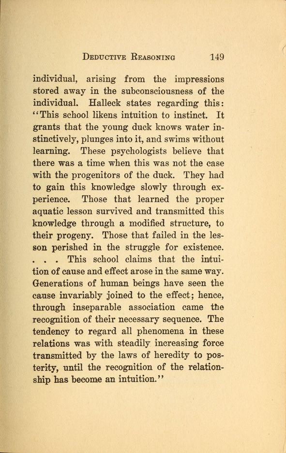 individual, arising from the impressions stored away in the subconsciousness of the individual. Halleck states regarding this: "This school likens intuition to instinct. It grants that the young duck knows water instinctively, plunges into it, and swims without learning. These psychologists believe that there was a time when this was not the case with the progenitors of the duck. They had to gain this knowledge slowly through experience. Those that learned the proper aquatic lesson survived and transmitted this knowledge through a modified structure, to their progeny. Those that failed in the lesson perished in the struggle for existence.