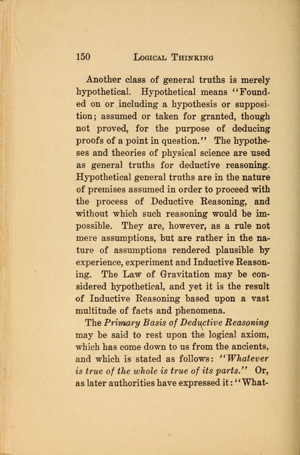 Another class of general truths is merely hypothetical. Hypothetical means "Founded on or including a hypothesis or supposition; assumed or taken for granted, though not proved, for the purpose of deducing proofs of a point in question." The hypotheses and theories of physical science are used as general truths for deductive reasoning. Hypothetical general truths are in the nature of premises assumed in order to proceed with the process of Deductive Reasoning, and without which such reasoning would be impossible. They are, however, as a. rule not mere assumptions, but are rather in the nature of assumptions rendered plausible by experience, experiment and Inductive Reasoning. The Law of Gravitation may be considered hypothetical, and yet it is the result of Inductive Reasoning based upon a vast multitude of facts and phenomena.