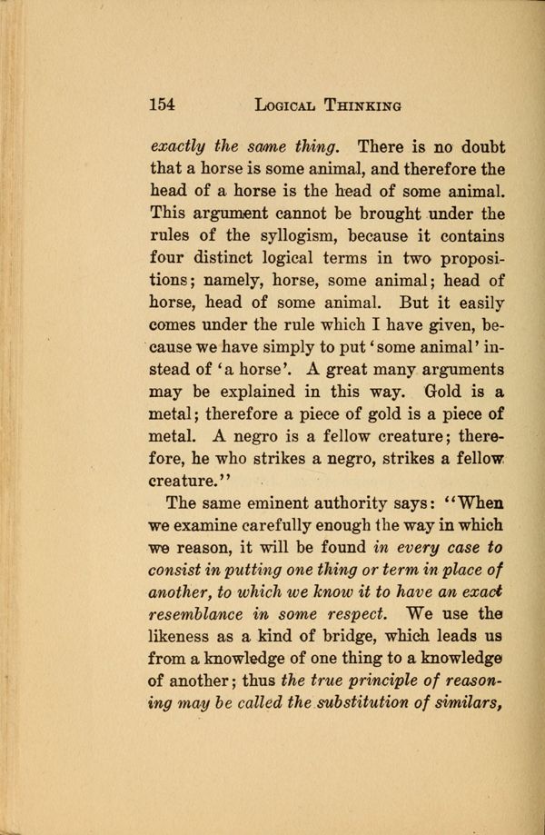 exactly the some thing. There is no doubt that a horse is some animal, and therefore the head of a horse is the head of some animal. This argument cannot be brought under the rules of the syllogism, because it contains four distinct logical terms in two propositions; namely, horse, some animal; head of horse, head of some animal. But it easily comes under the rule which I have given, because we have simply to put `some animal' instead of 'a horse'. A great many arguments may be explained in this way. Gold is a metal; therefore a piece of gold is a piece of metal. A negro is a fellow creature; therefore, he who strikes a negro, strikes a fellow creature."