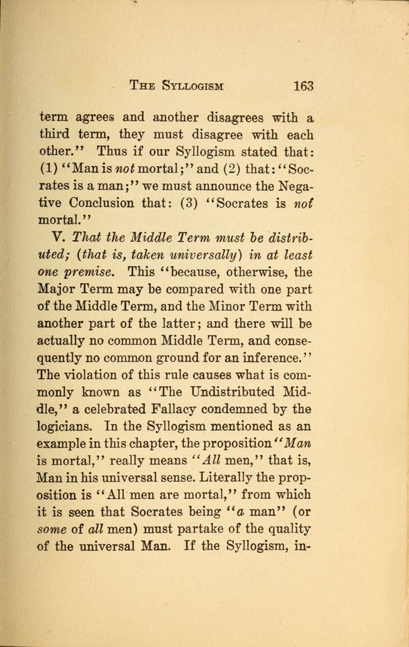 V. That the Middle Term must be distributed; (that is, taken universally) in at least one premise. This "because, otherwise, the Major Term may be compared with one part of the Middle Term, and the Minor Term with another part of the latter; and there will be actually no common Middle Term, and consequently no common ground for an inference." The violation of this rule causes what is commonly known as "The Undistributed Middle," a celebrated Fallacy condemned by the logicians. In the Syllogism mentioned as an example in this chapter, the proposition "Man is mortal," really means "All men," that is, Man in his universal sense. Literally the proposition is "All men are mortal," from which it is seen, that Socrates being "a man" (or some of all men) must partake of the quality of the universal Man. If the Syllogism, instead,