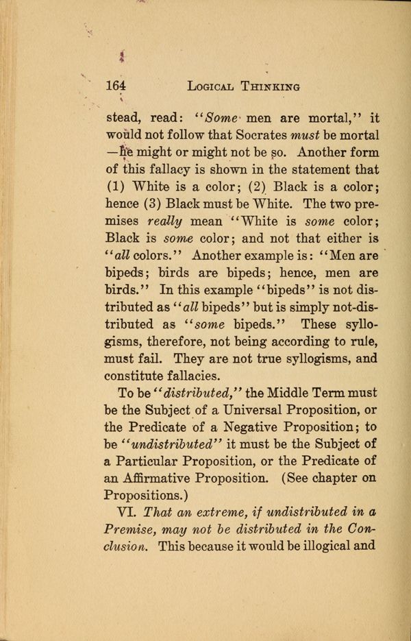 The two premises really mean "White is some color; Black is some color; and not that either is "all colors." Another example is: "Men are bipeds; birds are bipeds; hence, men are birds." In this example "bipeds" is not distributed as "all bipeds" but is simply not-distributed as "some bipeds." These syllogisms, therefore, not being according to rule, must fail. They are not true syllogisms, and constitute fallacies.