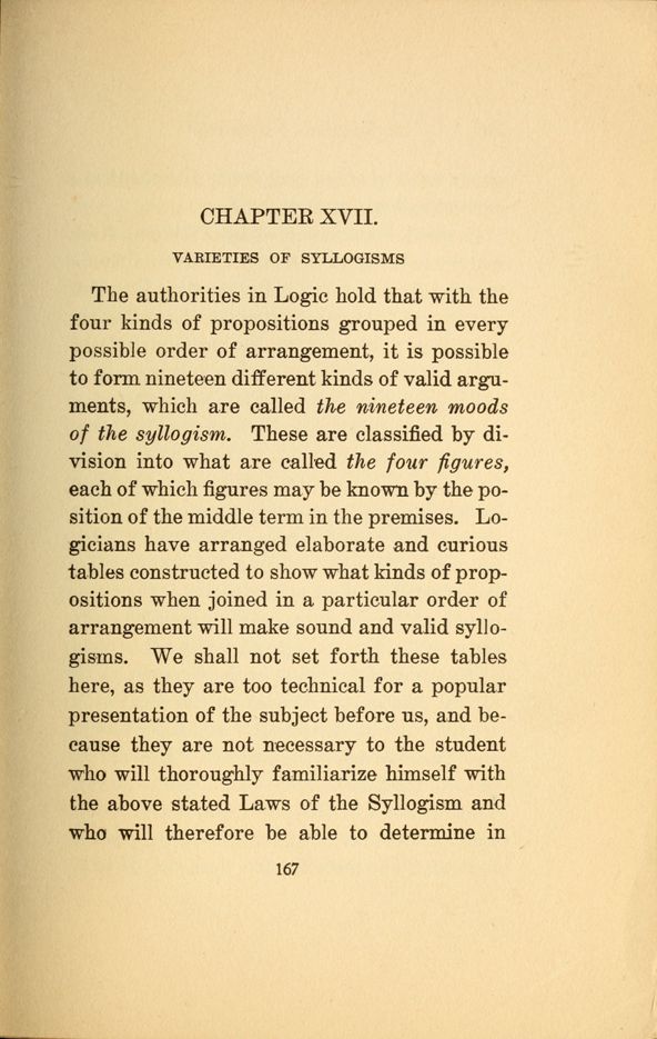 The authorities in Logic hold that with the four kinds of propositions grouped in every possible order of arrangement, it is possible to form nineteen different kinds of valid arguments, which are called the nineteen moods of the syllogism. These are classified by division into what are called the four figures, each of which figures may be known by the position of the middle term in the premises. Logicians have arranged elaborate and curious tables constructed to show what kinds of propositions when joined in a particular order of arrangement will make sound and valid syllogisms. We shall not set forth these tables here, as they are too technical for a popular presentation of the subject before us, and because they are not necessary to the student who will thoroughly familiarize himself with the above stated Laws of the Syllogism and who will therefore be able to determine in
