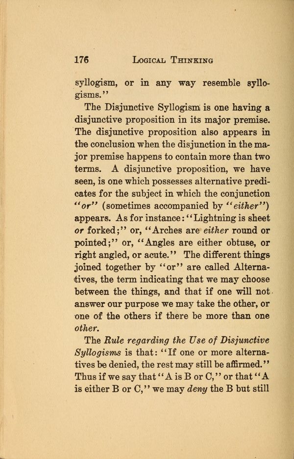 The Disjunctive Syllogism, is one having a disjunctive proposition in its major premise. The disjunctive proposition also appears in the conclusion when the disjunction in the major premise happens to contain more than two terms. A disjunctive proposition, we have seen, is one which possesses alternative predicates for the subject in which the conjunction "or" (sometimes accompanied by "either") appears. As for instance: "Lightning is sheet or forked " or, "Arches are either round or pointed;" or, "Angles are either obtuse, or right angled, or acute." The different things joined together by " or" are called Alternatives, the term indicating that we may choose between the things, and that if one will not answer our purpose we may take the other, or one of the others if there be more than one other.