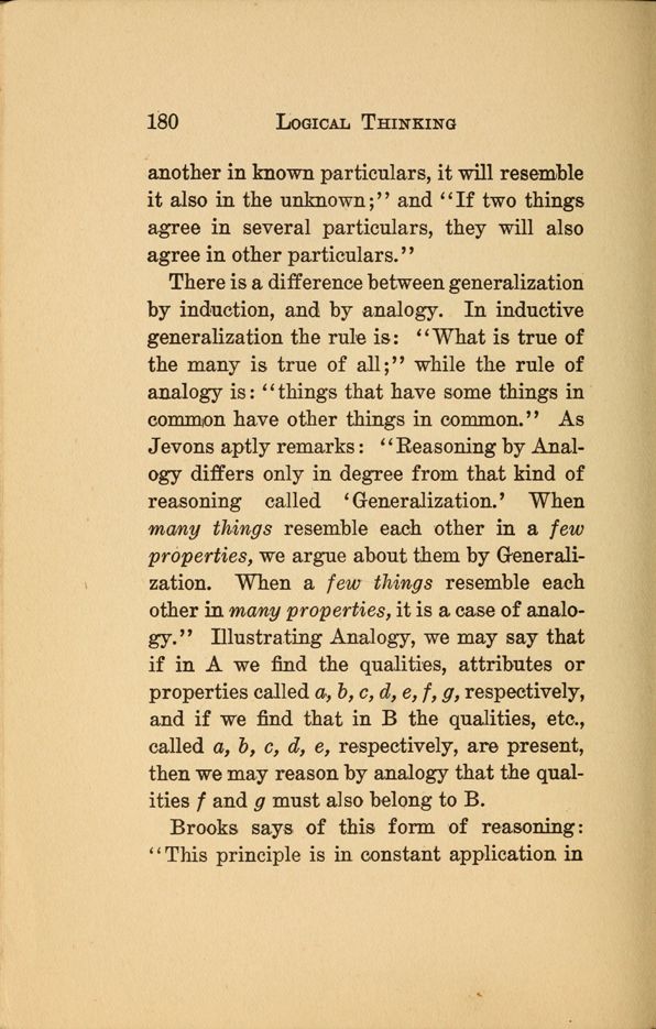 There is a difference between generalization by induction, and by analogy. In inductive generalization the rule is: "What is true of the many is true of all;" while the rule of analogy is: "things that have some things in common have other things in common." As Jevons aptly remarks: "Reasoning by Analogy differs only in degree from that kind of reasoning called 'Generalization.' When many things resemble each other in a few properties, we argue about, them by Generalization. When a few things resemble each other in many properties, it is a case of analogy." Illustrating Analogy, we may say that if in A we find the qualities, attributes or properties called a, b, c, d, e, f, g, respectively, and if we find that in B the qualities, etc., called a, b, c, d, e, respectively, are present, then we may reason by analogy that the qualities f and g must also belong to B.