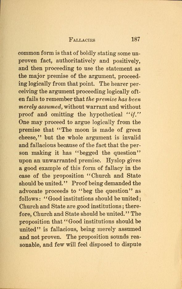 1 - Reasoning - 2 - Process of Reasoning - 3 - The Concept - 4 - The Use of Concepts - 5 - Concepts and Images - 6 - Terms - 7 - Meaning of Terms - 8 - Judgments - 9 - Propositions - 10 - Immediate Reasoning - 11 - Inductive Reasoning - 12 - Reasoning by Induction - 13 - Theory and Hypotheses - 14 - Making and Testing Hypotheses - 15 - Deductive Reasoning - 16 - The Syllogism - 17 - Varieties of Syllogisms - 18 - Reasoning by Analogy - 19 - Fallacies -