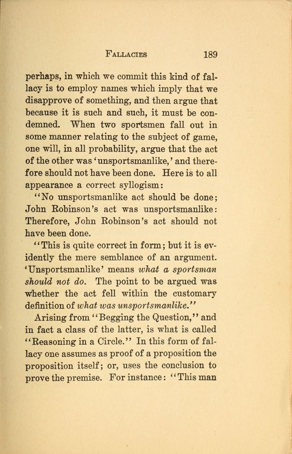 perhaps, in which we commit this kind of fallacy is to employ names which imply that we disapprove of something, and then argue that because it is such and such, it must be condemned. When two sportsmen fall out in some manner relating to the subject of game, one will, in all probability, argue that the act of the other was 'unsportsmanlike,' and therefore should not have been done. Here is to all appearance a correct syllogism: