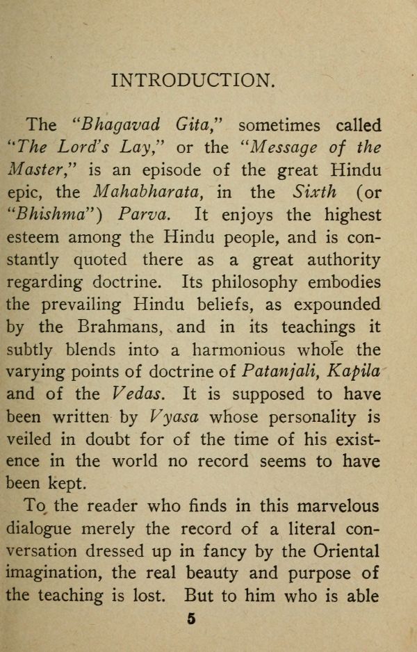 The "Bhagavad Gita" sometimes called ''The Lord's Lay;' or the "Message of the Master," is an episode of the great Hindu epic, the Mahabharata, in the Sixth (or "Bhishma") Parva. It enjoys the highest esteem among the Hindu people, and is constantly quoted there as a great authority regarding doctrine. Its philosophy embodies the prevailing Hindu beliefs, as expounded by the Brahmans, and in its teachings it subtly blends into a harmonious whole the varying points of doctrine of Patanjali, Kapila and of the Vedas. It is supposed to have been written by Vyasa whose personality is veiled in doubt for of the time of his existence in the world no record seems to have been kept.
