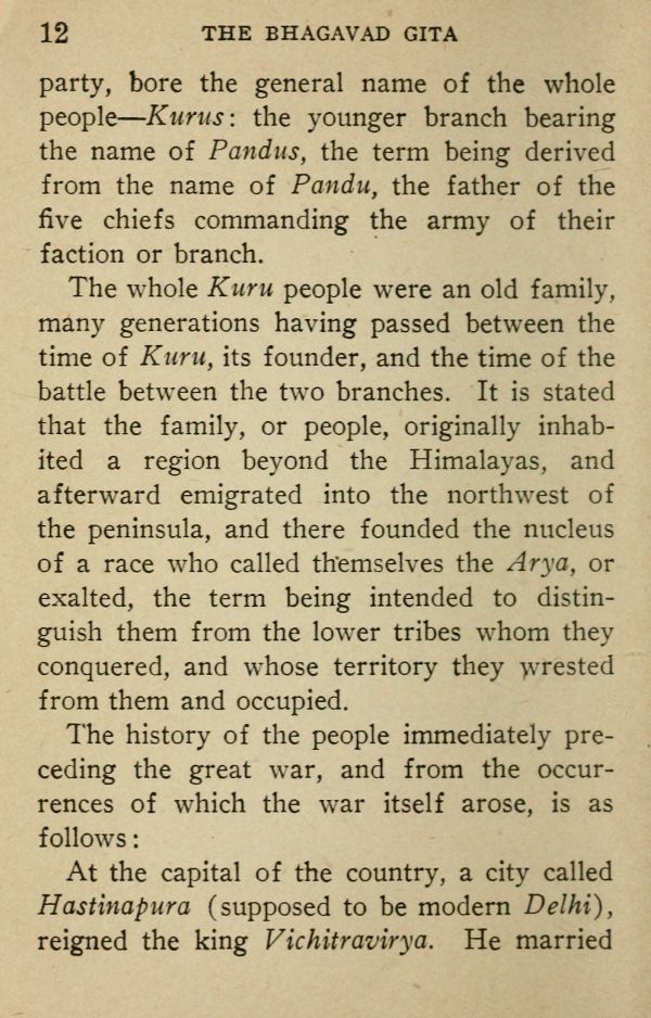 The whole Kuru people were an old family, many generations having passed between the time of Kuru, its founder, and the time of the battle between the two branches. It is stated that the family, or people, originally inhabited a region beyond the Himalayas, and afterward emigrated into the northwest of the peninsula, and there founded the nucleus of a race who called themselves the Arya, or exalted, the term being intended to distinguish them from the lower tribes whom they conquered, and whose territory they wrested from them and occupied.