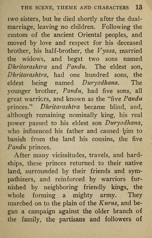 two sisters, but he died shortly after the dual marriage, leaving no children. Following the custom of the ancient Oriental peoples, and moved by love and respect for his deceased brother, his half-brother, the Vyasa, married the widows, and begat two sons named Dhritarashtra and Pandu. The eldest son, Dhritarashtra, had one hundred sons, the eldest being named Duryodhana. The younger brother, Pandu, had five sons, all great warriors, and known as the "five Pandu princes." Dhritarashtra became blind, and, although remaining nominally king, his real power passed to his eldest son Duryodhana, who influenced his father and caused him to banish from the land his cousins, the five Pandu princes.