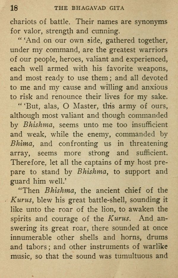 "Then Bhishma, the ancient chief of the Kurus, blew his great battle-shell, sounding it like unto the roar of the lion, to awaken the spirits and courage of the Kurus. And answering its great roar, there sounded at once innumerable other shells and horns, drums and tabors; and other instruments of warlike music, so that the sound was tumultuous and