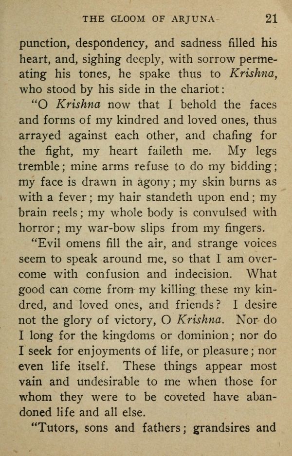 "O Krishna now that I behold the faces and forms of my kindred and loved ones, thus arrayed against each other, and chafing for the fight, my heart faileth me. My legs tremble; mine arms refuse to do my bidding; my face is drawn in agony; my skin burns as with a fever; my hair standeth upon end; my brain reels; my whole body is convulsed with horror; my war-bow slips from my fingers.