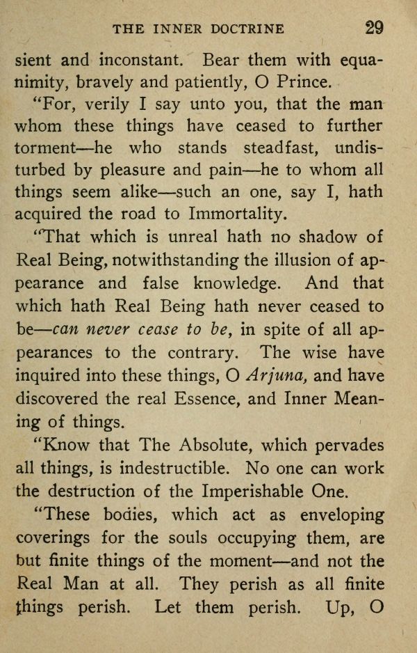 'That which is unreal hath no shadow of Real Being, notwithstanding the illusion of appearance and false knowledge. And that which hath Real Being hath never ceased to be --- can never cease to be, in spite of all appearances to the contrary. The wise have inquired into these things, O Arjuna, and have discovered the real Essence, and Inner Meaning of things.
