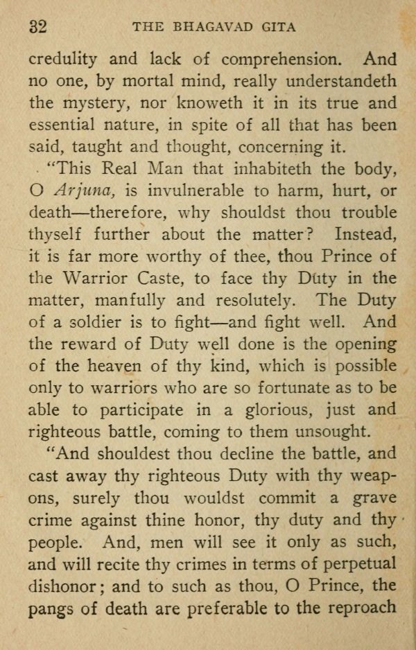 'This Real Man that inhabiteth the body, O Arjuna, is invulnerable to harm, hurt, or death --- therefore, why shouldst thou trouble thyself further about the matter? Instead, it is far more worthy of thee, thou Prince of the Warrior Caste, to face thy Duty in the matter, manfully and resolutely. The Duty of a soldier is to fight --- and fight well. And the reward of Duty well done is the opening of the heaven of thy kind, which is possible only to warriors who are so fortunate as to be able to participate in a glorious, just and righteous battle, coming to them unsought.