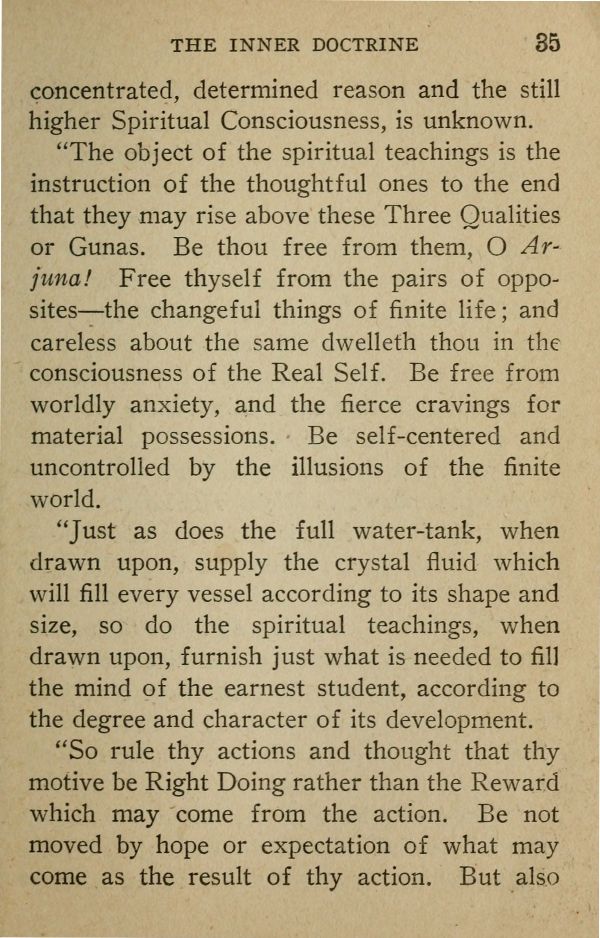 "The object of the spiritual teachings is the instruction of the thoughtful ones to the end that they may rise above these Three Qualities or Gunas. Be thou free from them, O Arjitna! Free thyself from the pairs of opposites --- the changeful things of finite life; and careless about the same dwelleth thou in the consciousness of the Real Self. Be free from worldly anxiety, and the fierce cravings for material possessions. Be self-centered and uncontrolled by the illusions of the finite world.