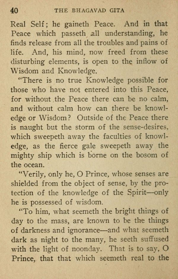 'There is no true Knowledge possible for those who have not entered into this Peace, for without the Peace there can be no calm, and without calm how can there be knowledge or Wisdom? Outside of the Peace there is naught but the storm of the sense-desires, which sweepeth away the faculties of knowledge, as the fierce gale sweepeth away the mighty ship which is borne on the bosom of the ocean.