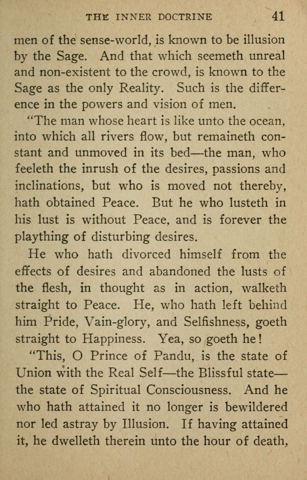 "The man whose heart is like unto the ocean, into which all rivers flow, but remaineth constant and unmoved in its bed --- the man, who feeleth the inrush of the desires, passions and inclinations, but who is moved not thereby, hath obtained Peace. But he who lusteth in his lust is without Peace, and is forever the plaything of disturbing desires.