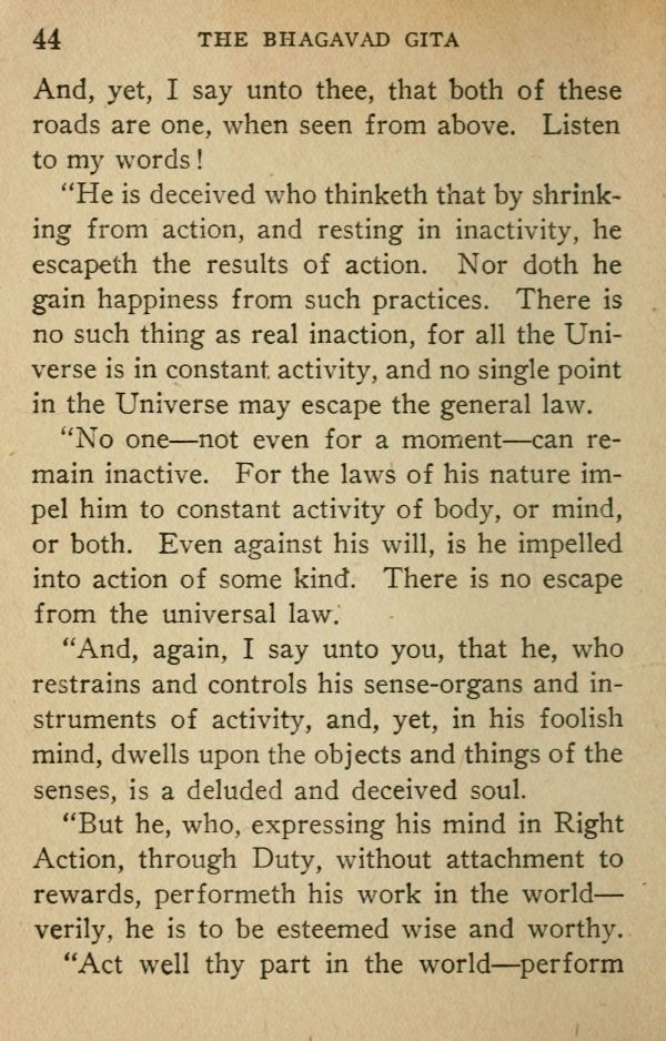 "He is deceived who thinketh that by shrinking from action, and resting in inactivity, he escapeth the results of action. Nor doth he gain happiness from such practices. There is no such thing as real inaction, for all the Universe is in constant activity, and no single point in the Universe may escape the general law.
