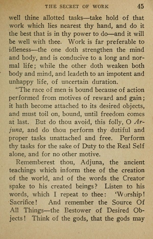 'The race of men is bound because of action performed from motives of reward and gain; it hath become attached to its desired objects, and must toil on, bound, until freedom comes at last. But do thou avoid, this folly, O Arjuna, and do thou perform thy dutiful and proper tasks unattached and free. Perform thy tasks for the sake of Duty to the Real Self alone, and for no other motive.